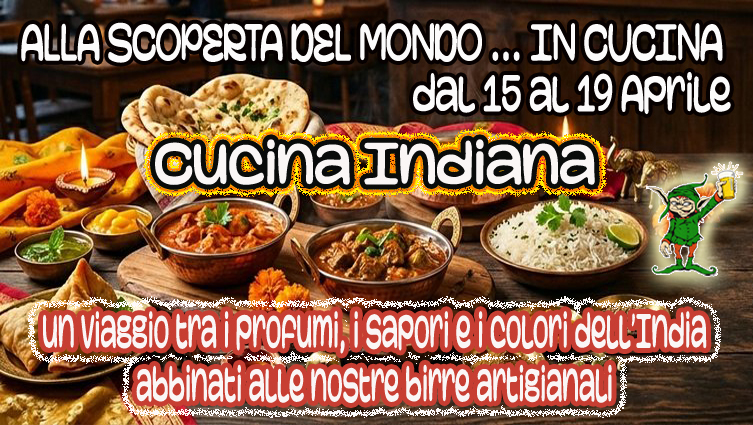 Un viaggio in India… senza lasciare il pub!da mercoledì 15 a domenica 19 Aprile, faremo un viaggio tra i profumi, i sapori e i colori dell’India abbinati alle nostre birre artigianali. Prenotazioni al tel/WhatsApp 3518456007