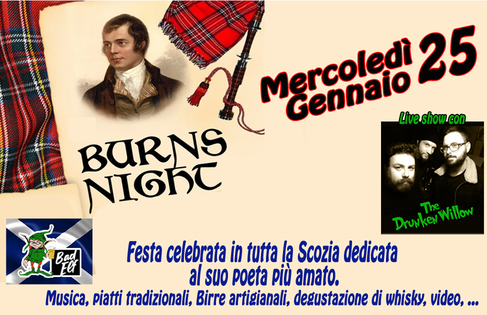 Come sempre, anche il Bad Elf pub in questo giorno si veste dei colori della Scozia organizzando la cena denominata “Burns supper”con piatti tradizionali; a seguire serata dedicata a birre artigianali e whisky scozzesi, musica, video e tanto altro …